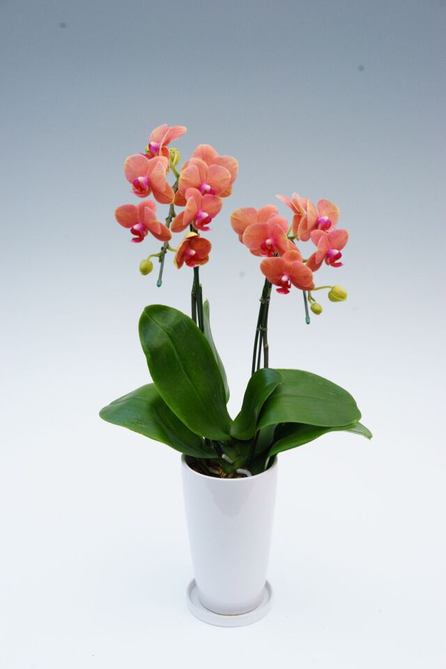 深みのあるオレンジ色が特徴のミディ胡蝶蘭です。リボンサービスあり。※デザイン性のある鉢を楽しんでいただくためラッピングサービスありません。小皿付き。高さ50㎝前後、幅20㎝前後。