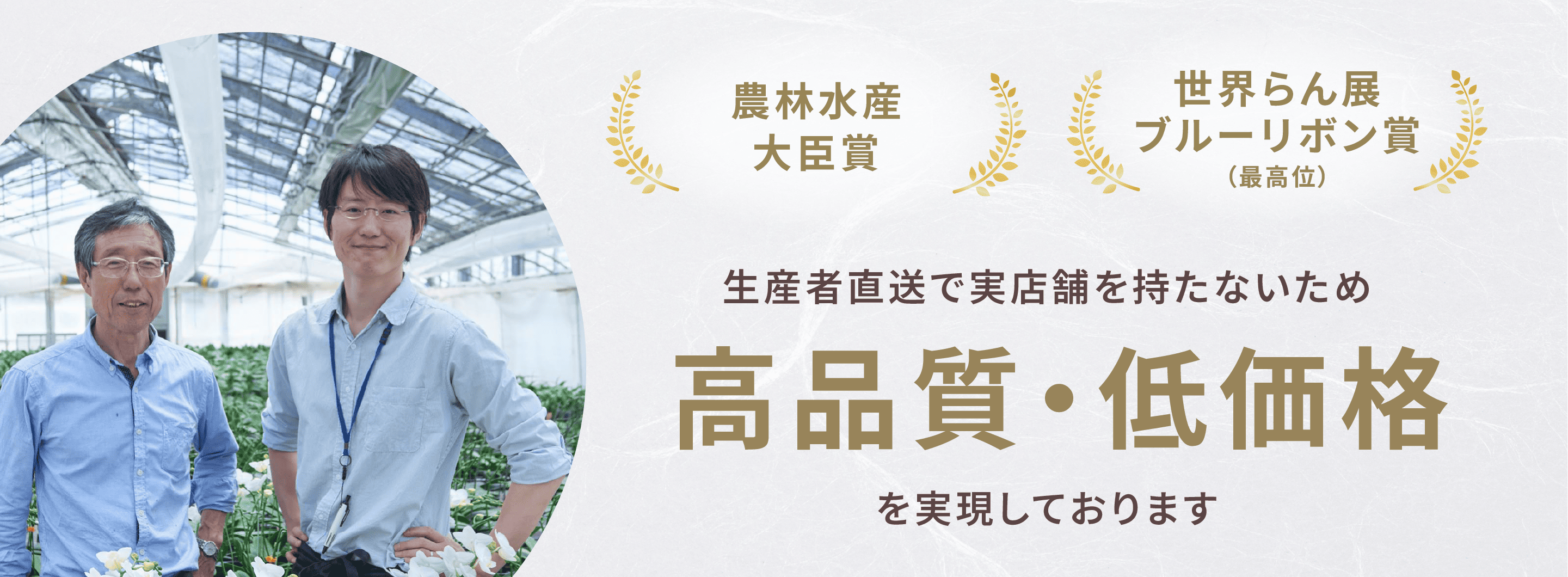 生産農家も一鉢の胡蝶蘭を育て出荷するまで3年程かかります。その価値を大事にしてお客様と我々販売業者と生産農家との三方良しを目指します。