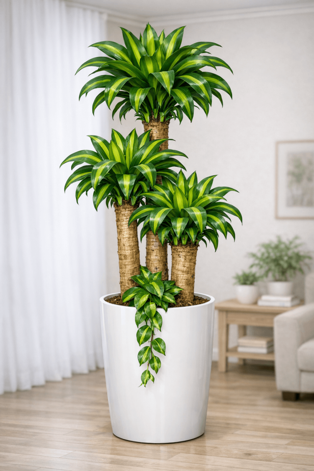 白のデザイン鉢で珍しい黄色のミディ胡蝶蘭5本立ちで構成されボリュウームもありながらコンパクトに仕上がっております。高さ60cm前後・幅50cm前後。デザイン性のある鉢を鑑賞していただくためにラッピングサービスはありません。板敷付き。