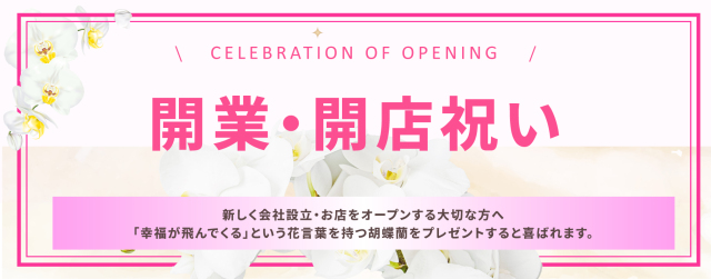 胡蝶蘭は「幸福が飛んでくる」という花言葉を持ちまた着床性の植物であることからその飛んできた幸福が「根付く」とされお店のオープンはもちろん会社設立にも縁起がいいものとして古くからお祝いとして贈られ続けています。