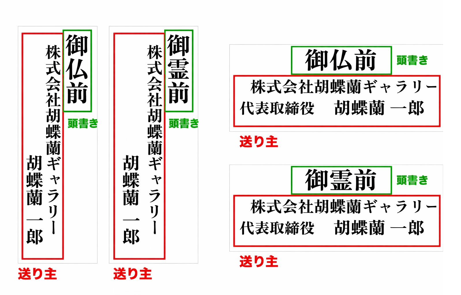 木札の記載例「送り主」のみ場合と「お届け先様と送り主併記」の場合